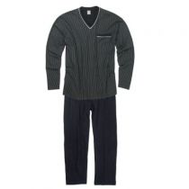 Le haut du pyjama a des fines rayures blanches, des manches longues, un col en V avec bande de renfort, une poche poitrine.
