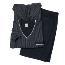 Le haut du pyjama a des fines rayures blanches, des manches courtes, un col en V avec bande de renfort, une poche poitrine.
